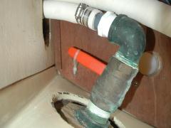 Now, PVC pipe is not generally recommended for a boat. Because it is rigid, it will crack as the boat flexes. But I reasoned that if I let the pipe float free, mounted only by the hose connections, I wouldn't suffer any such problems. Time will tell, but the first year looks encouraging.
