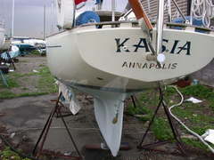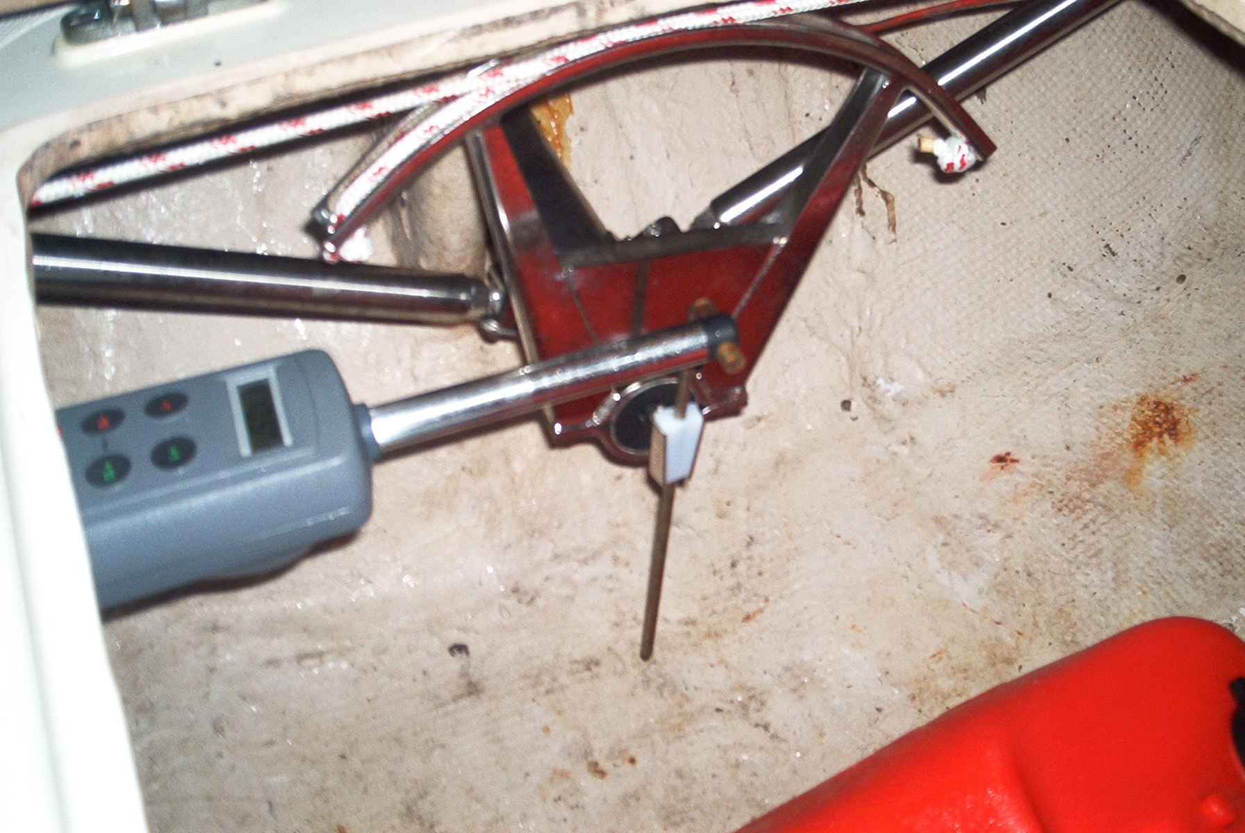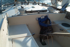The Cape Horn (or Cap Horn, in French) self-steering windvane is designed and built by Yves Gelinas, the owner of A30 Jean du Sud. Here we see it installed on Kasia, #383, then skippered by Chris Katehis. You can see the control lines emerging from the lazarette bulkhead and passing through turning blocks before connecting to the tiller with cam cleats. Inside the lazarette, an electronic tiller pilot is connected to the rig for days when the wind is too light. |
