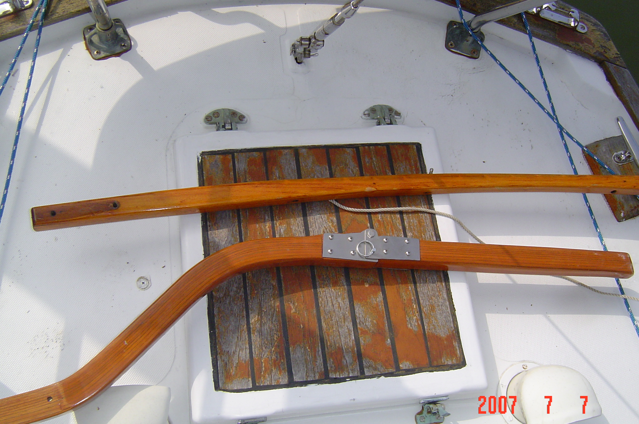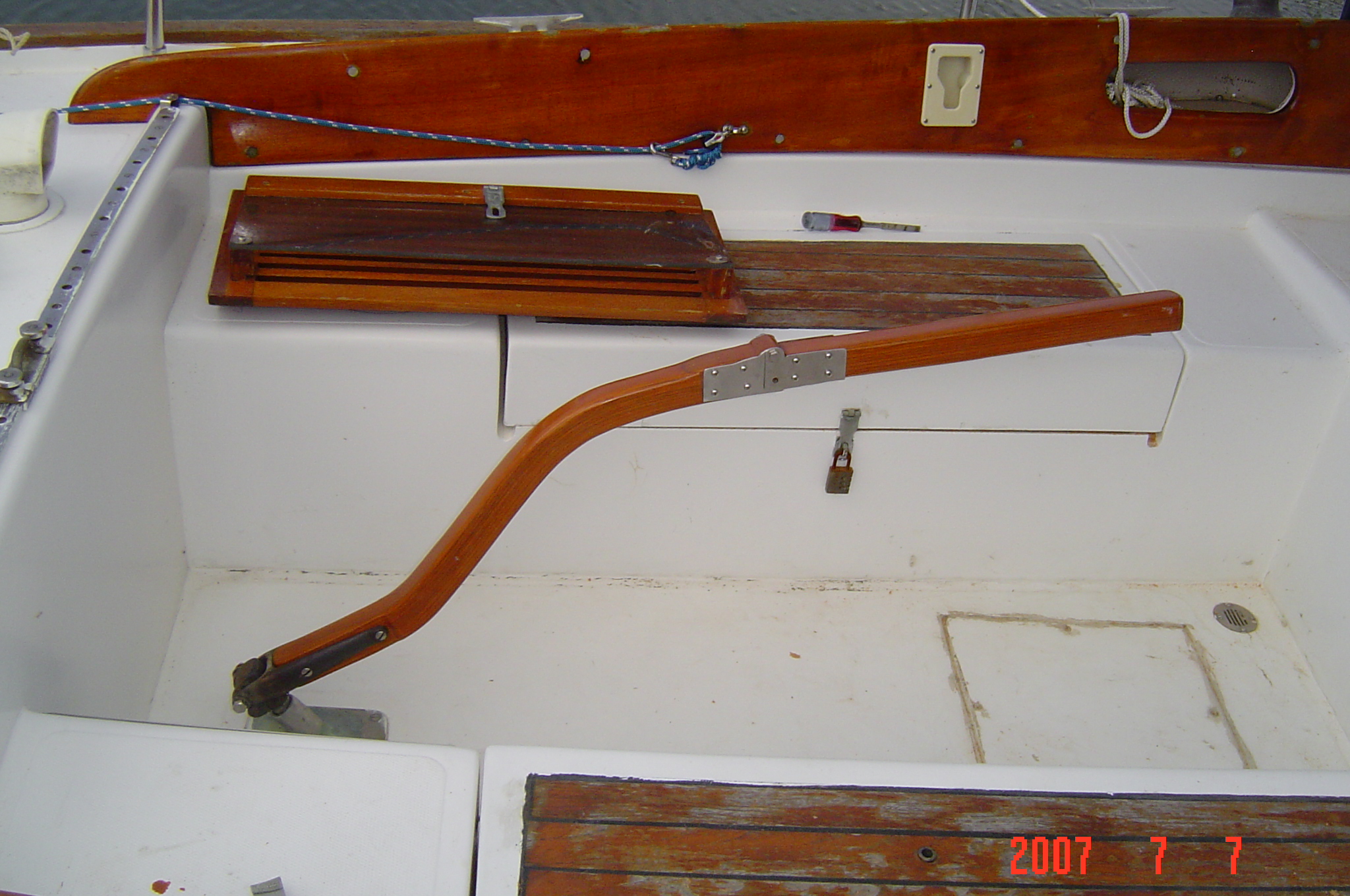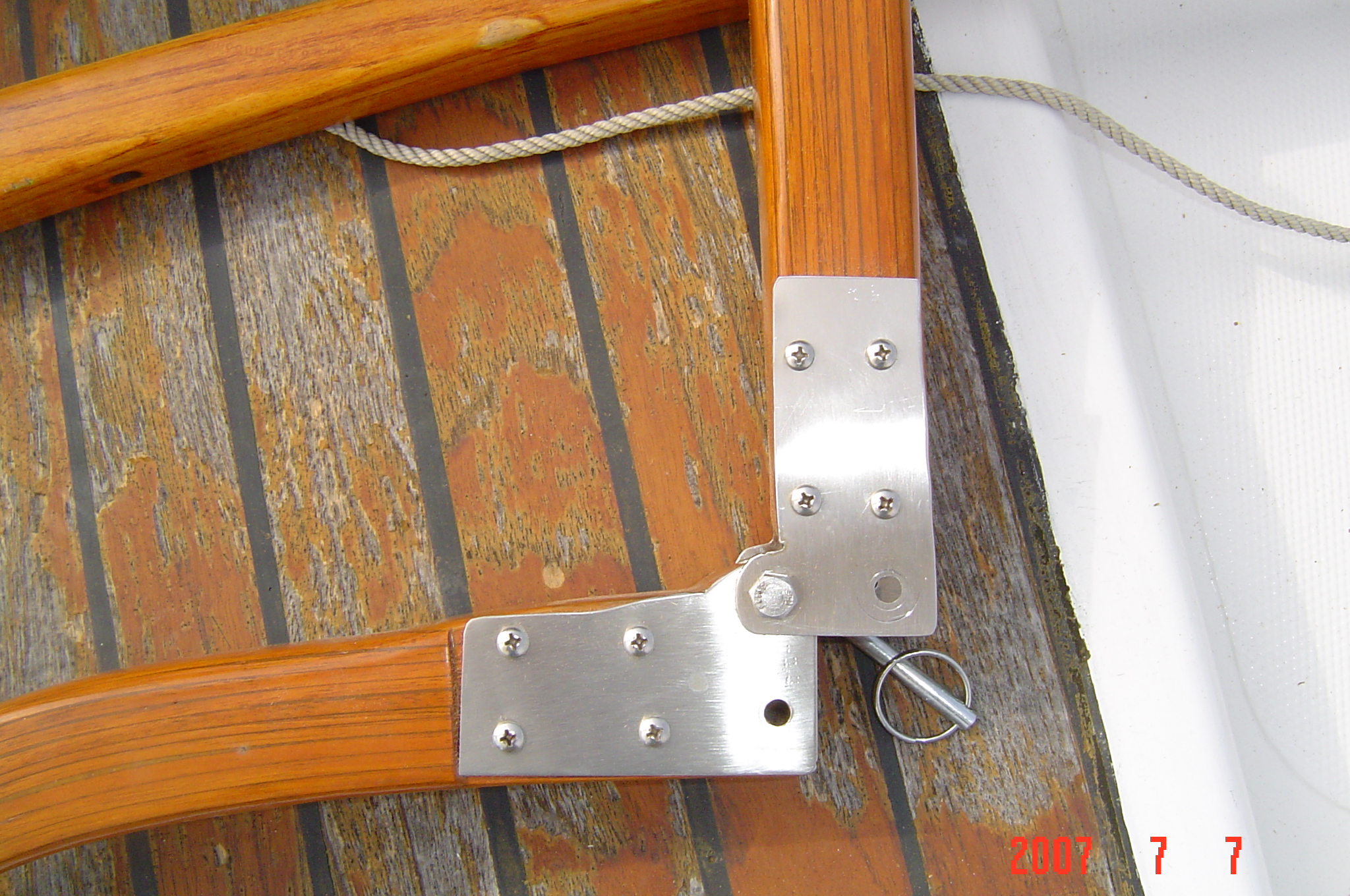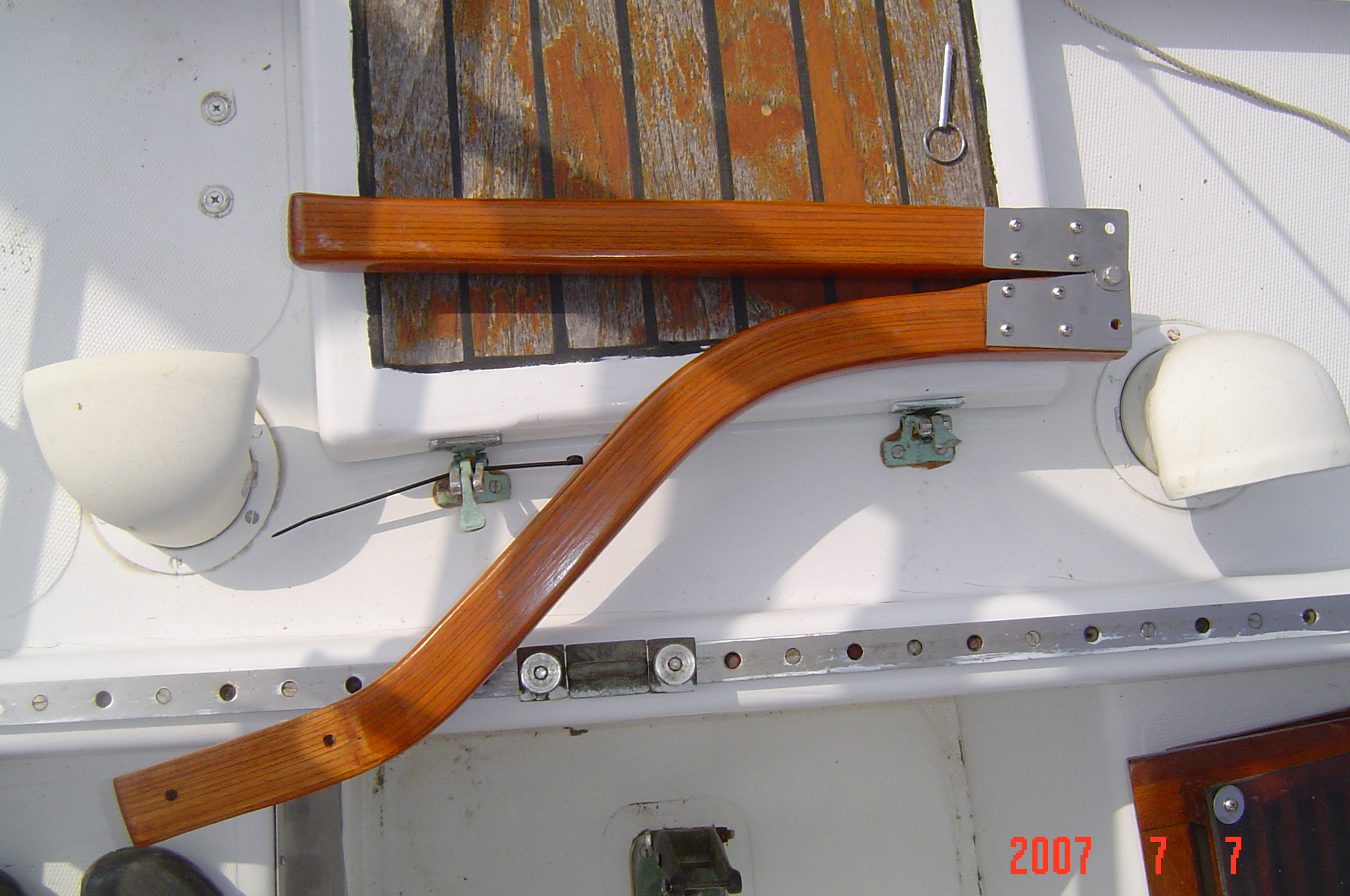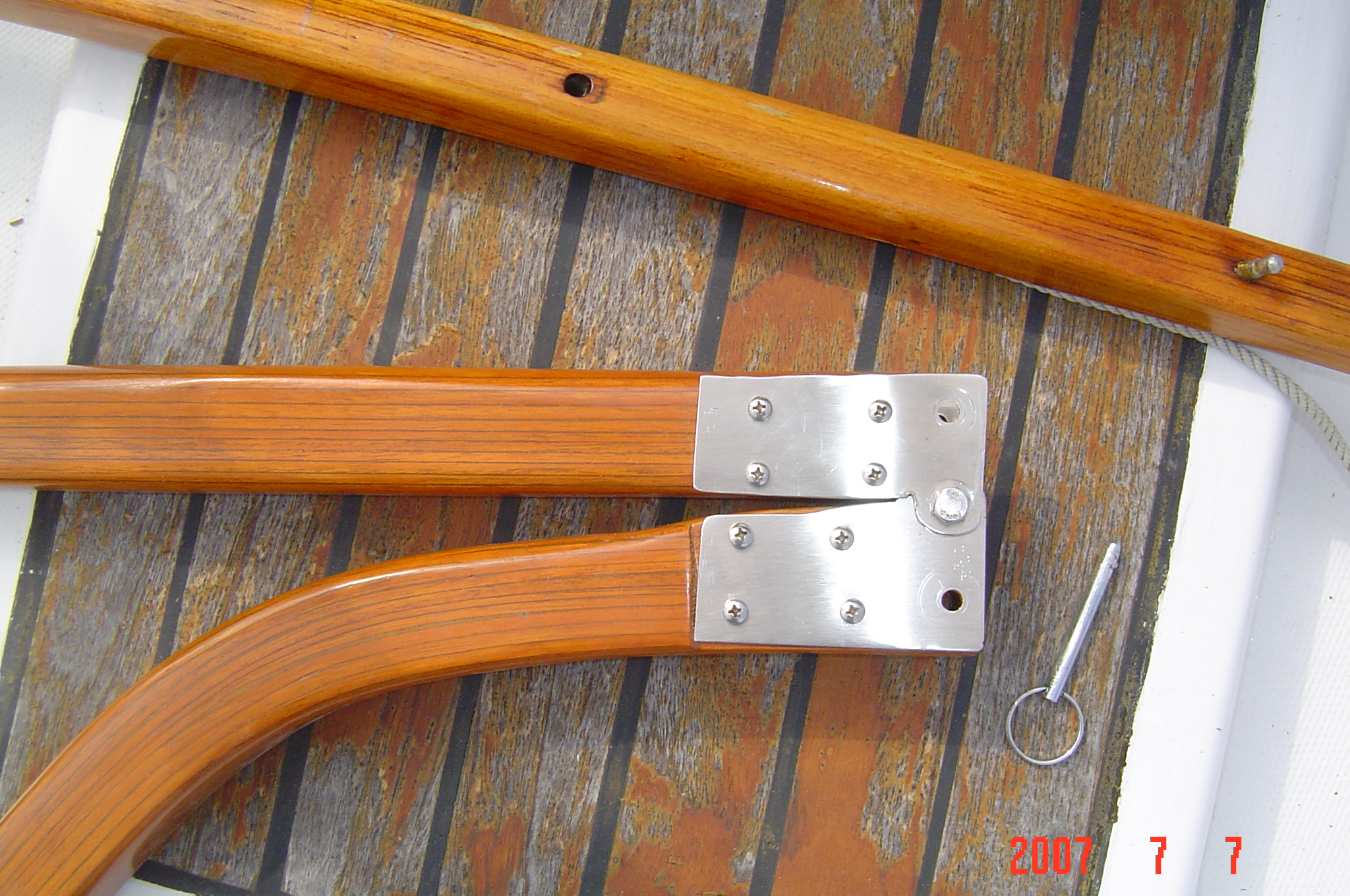 After looking at a few samples on the Alberg site I decided to try my own. The first test was a failure because of cracking in the bends. The second test turned out fine. It has eleven layers of mahogany cut at 3/16" on the table saw. This was made with simple tools, table saw, belt sander and band saw to cut the stainless hinges. If anyone has any questions or would like the blank for bending or the pine tiller to experiment with just let me know. |