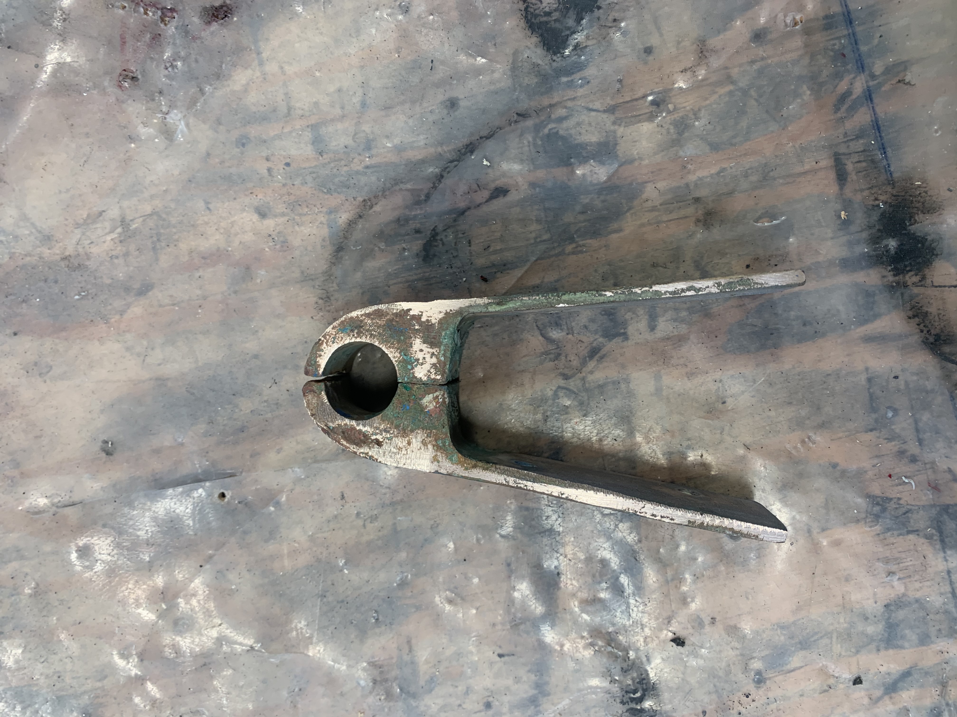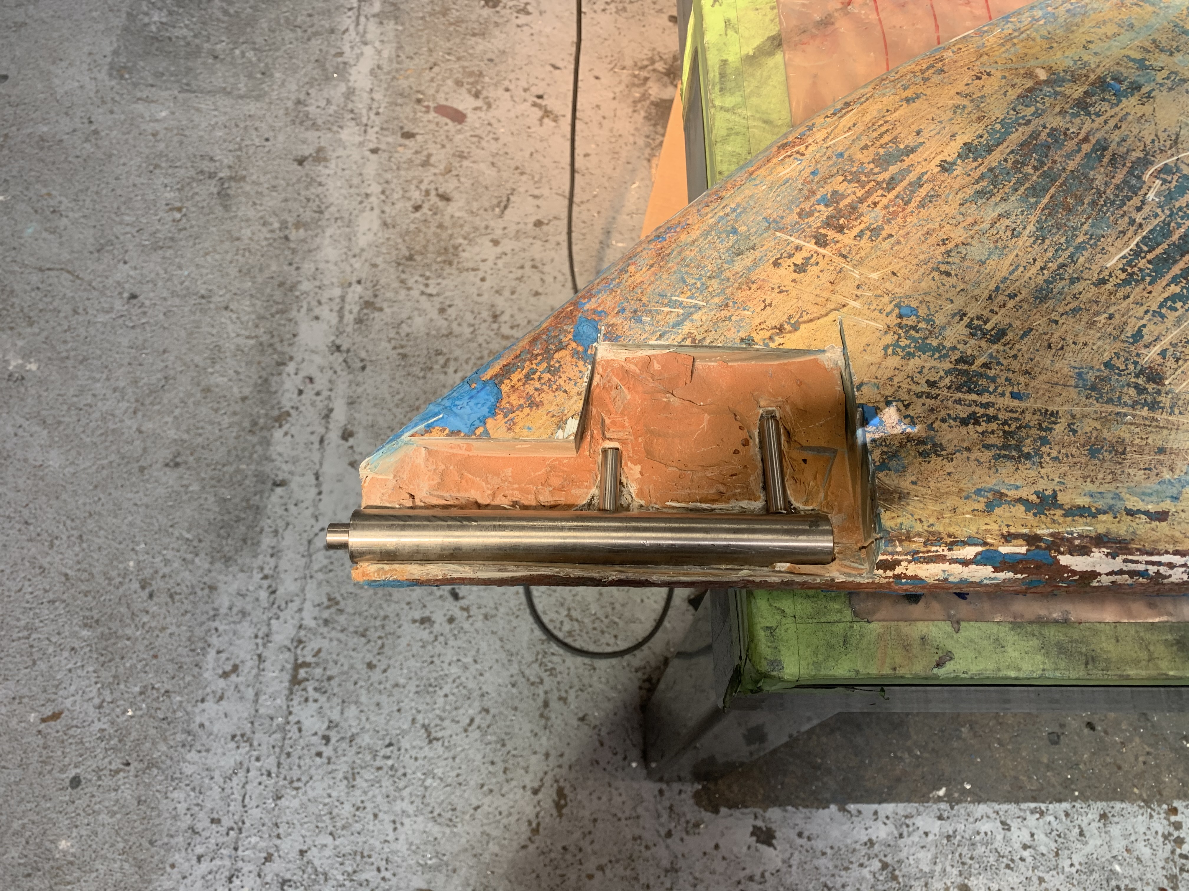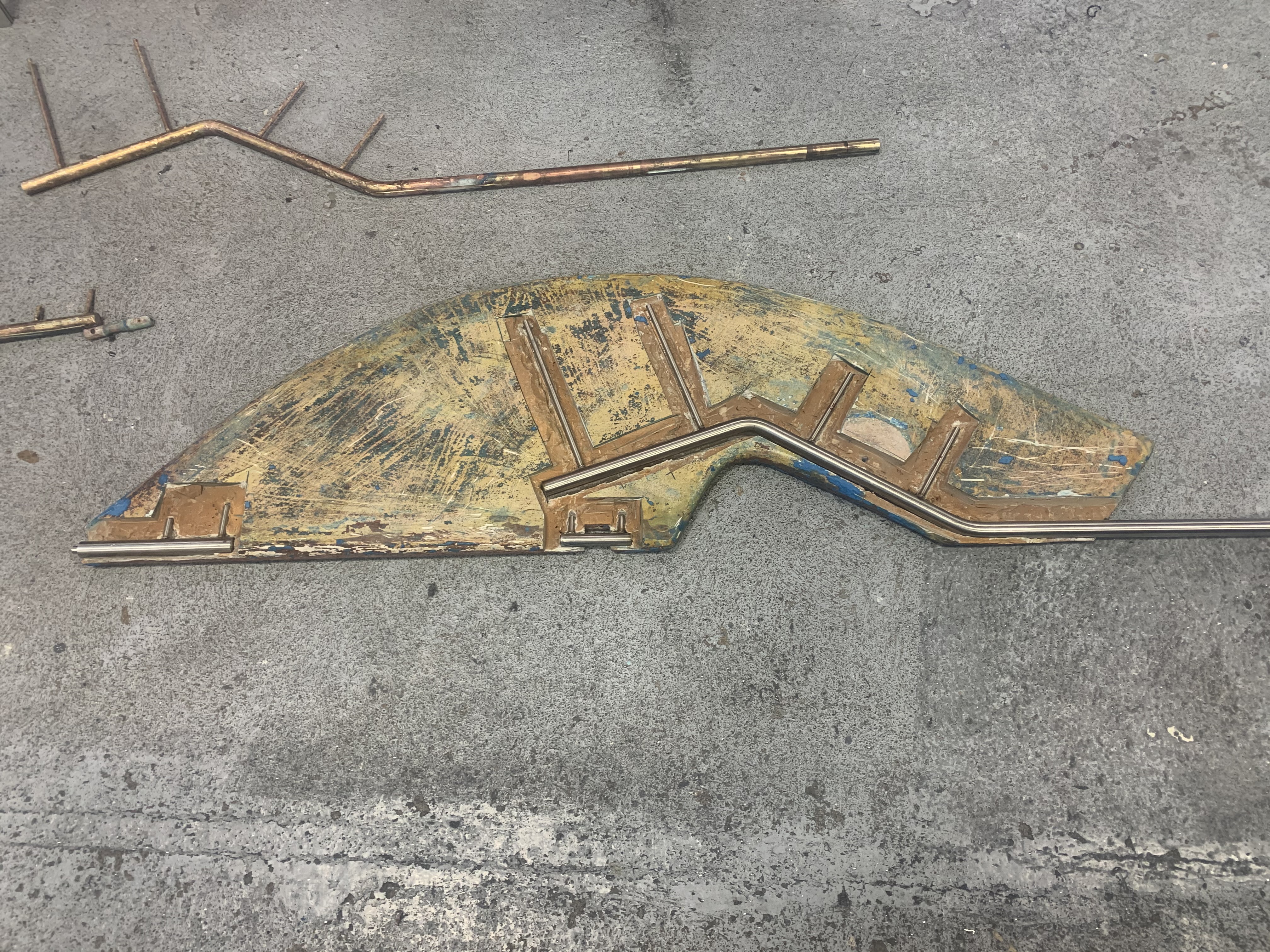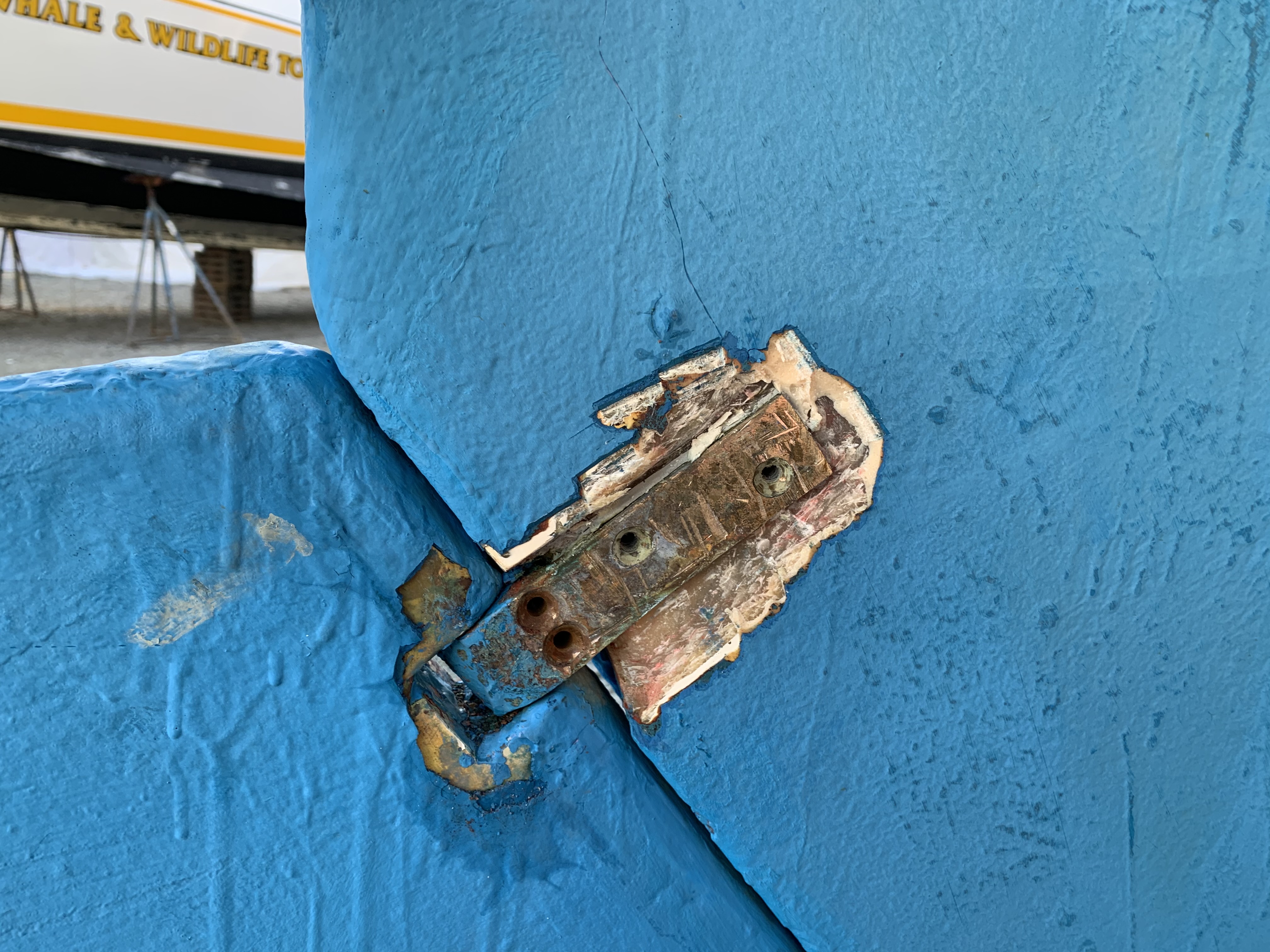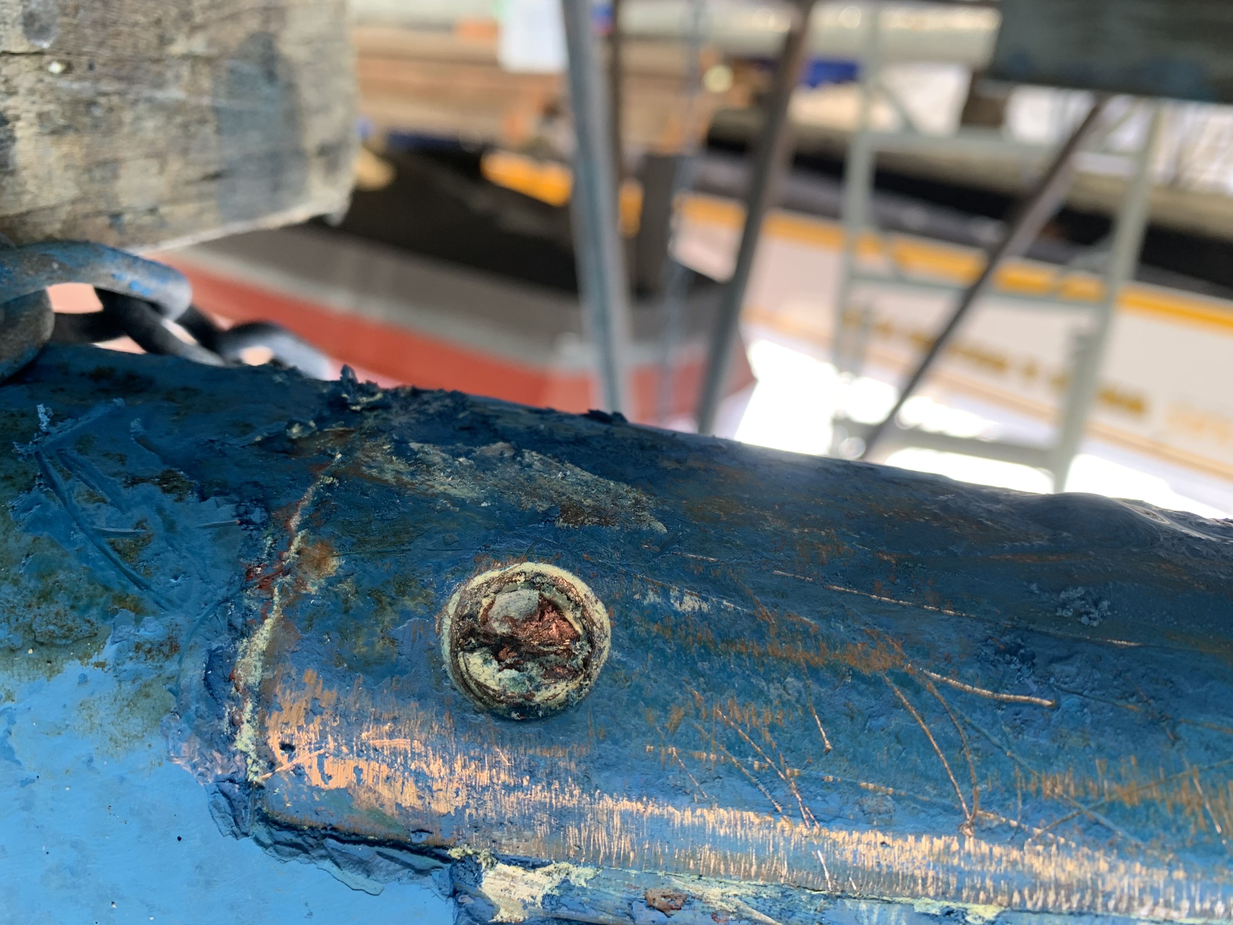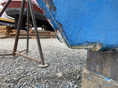 If there was a bit more pin, the solution is just to make a bushing to fit between the hole in the rudder shoe and the pin. But this pin was too far gone for that. The second solution is to cut out the pin, drill and tap a hole in the bottom section and screw in a new pin. I might have done that if there hadn't been other problems.