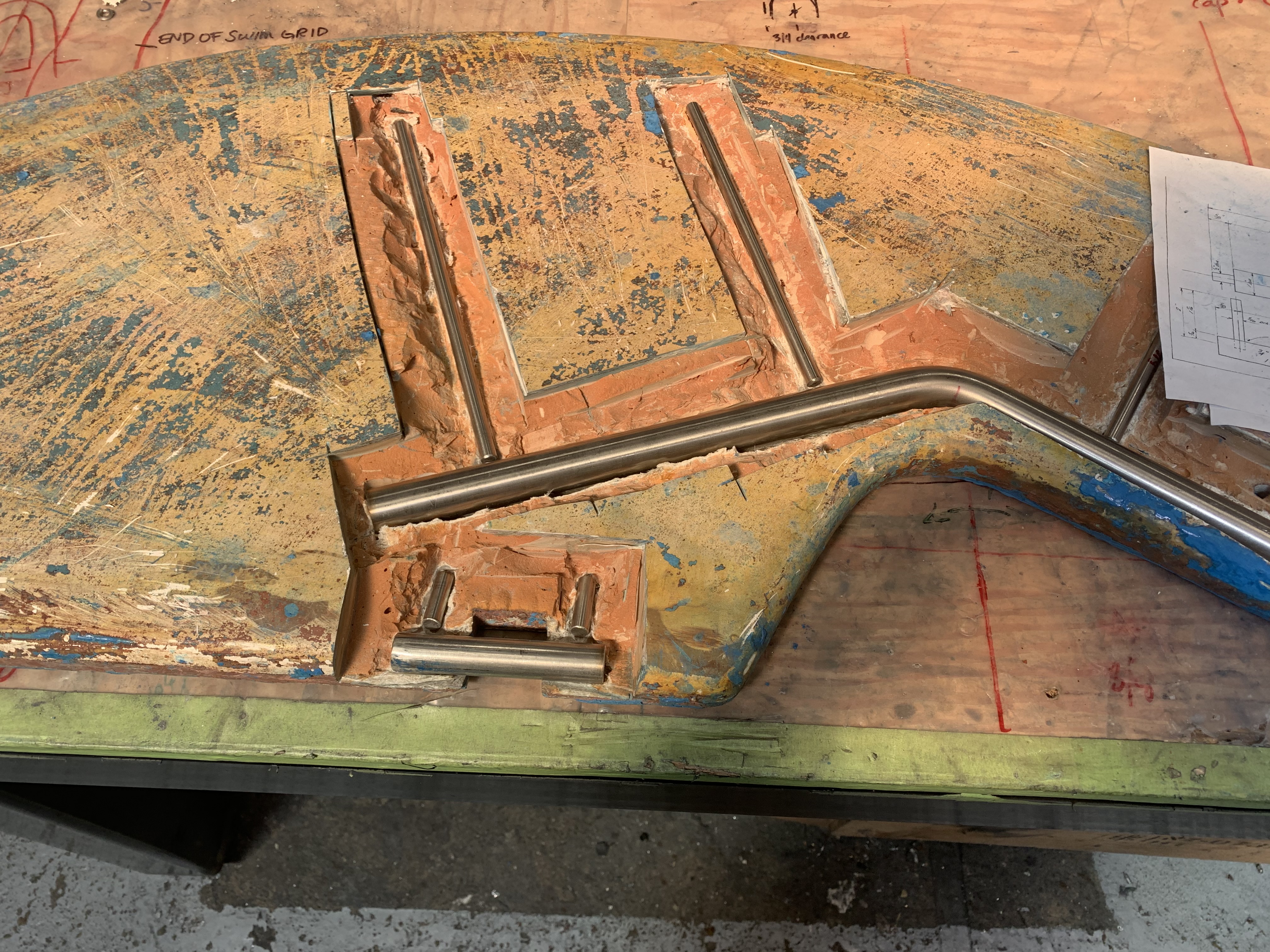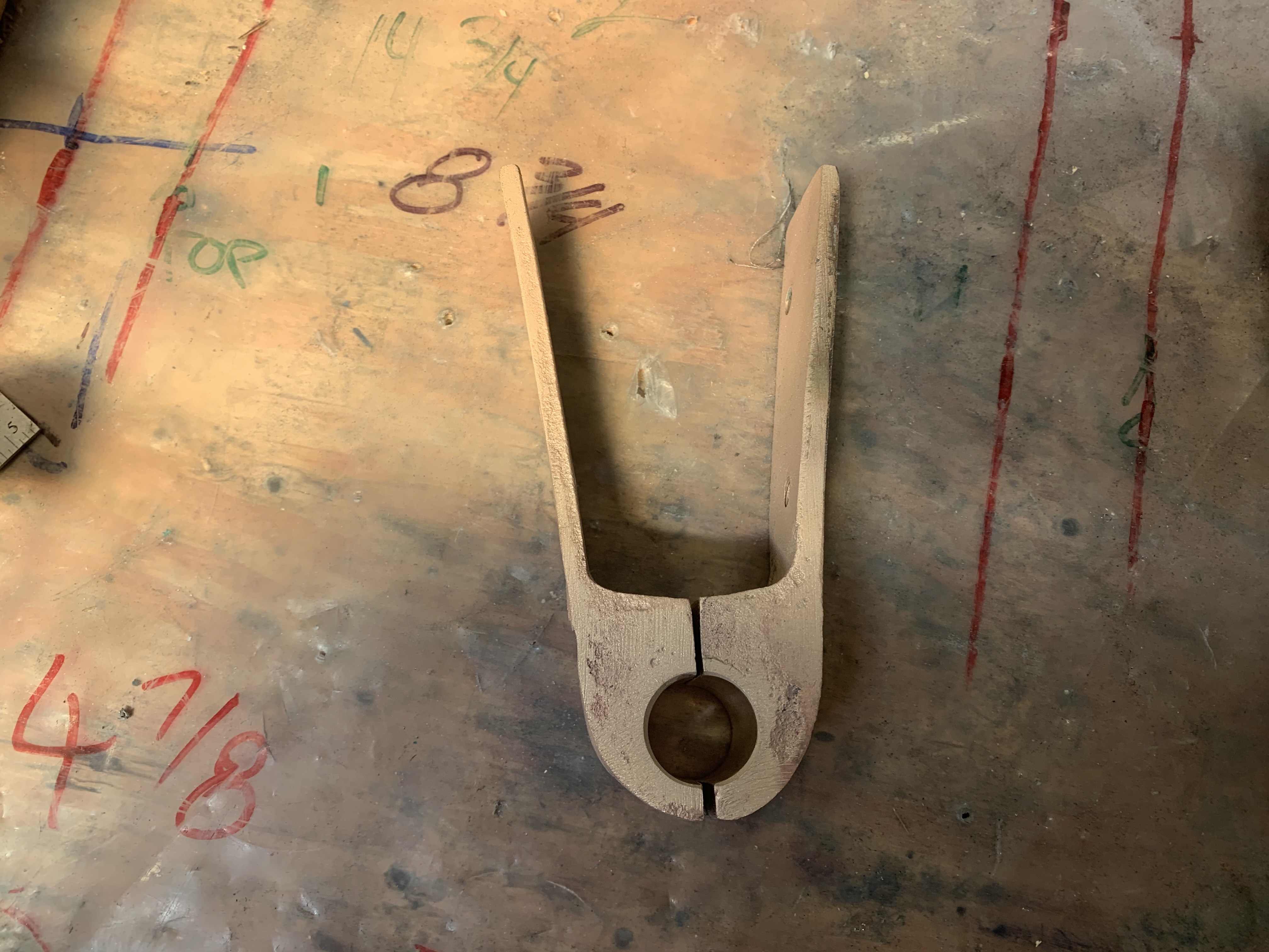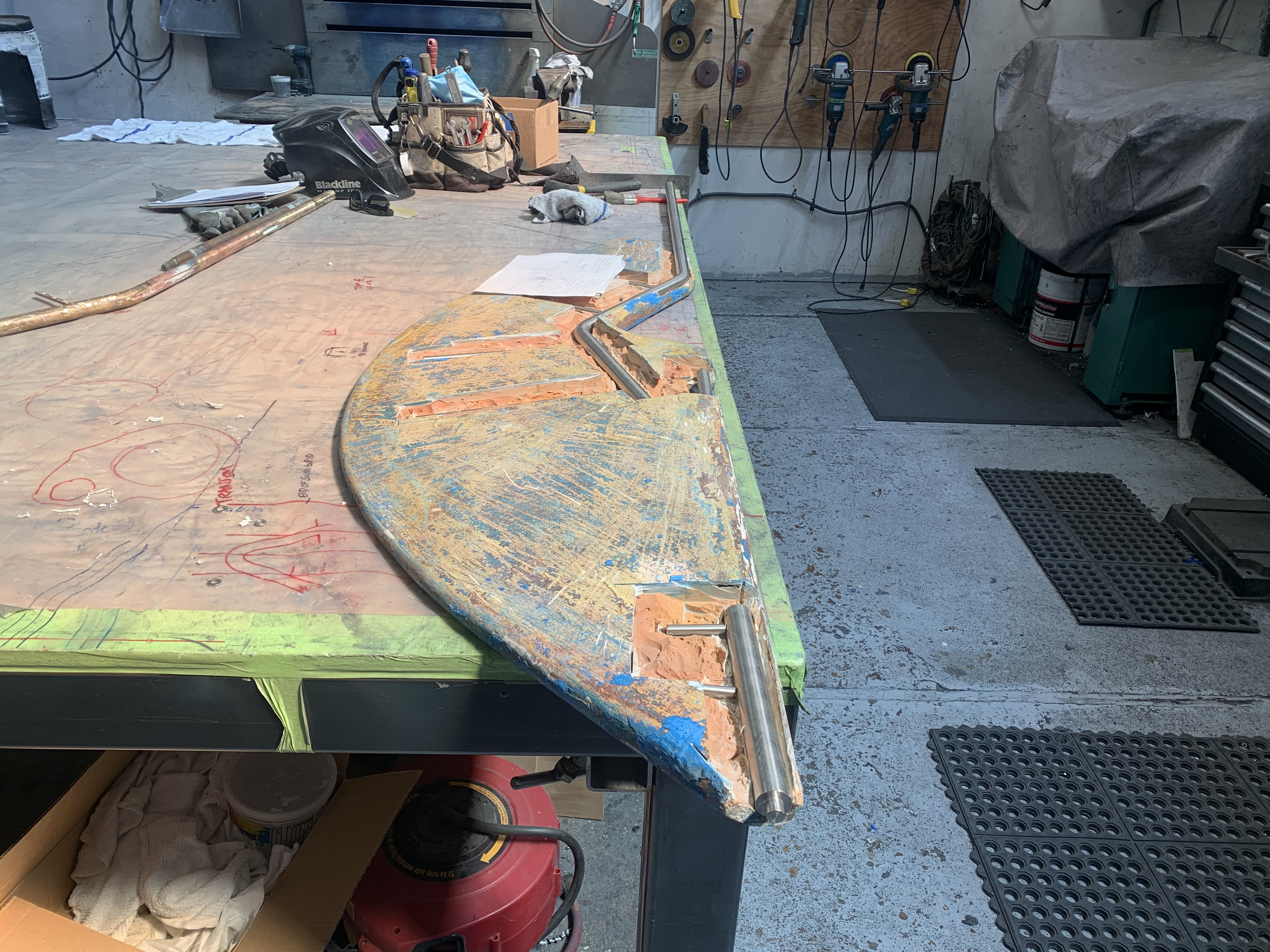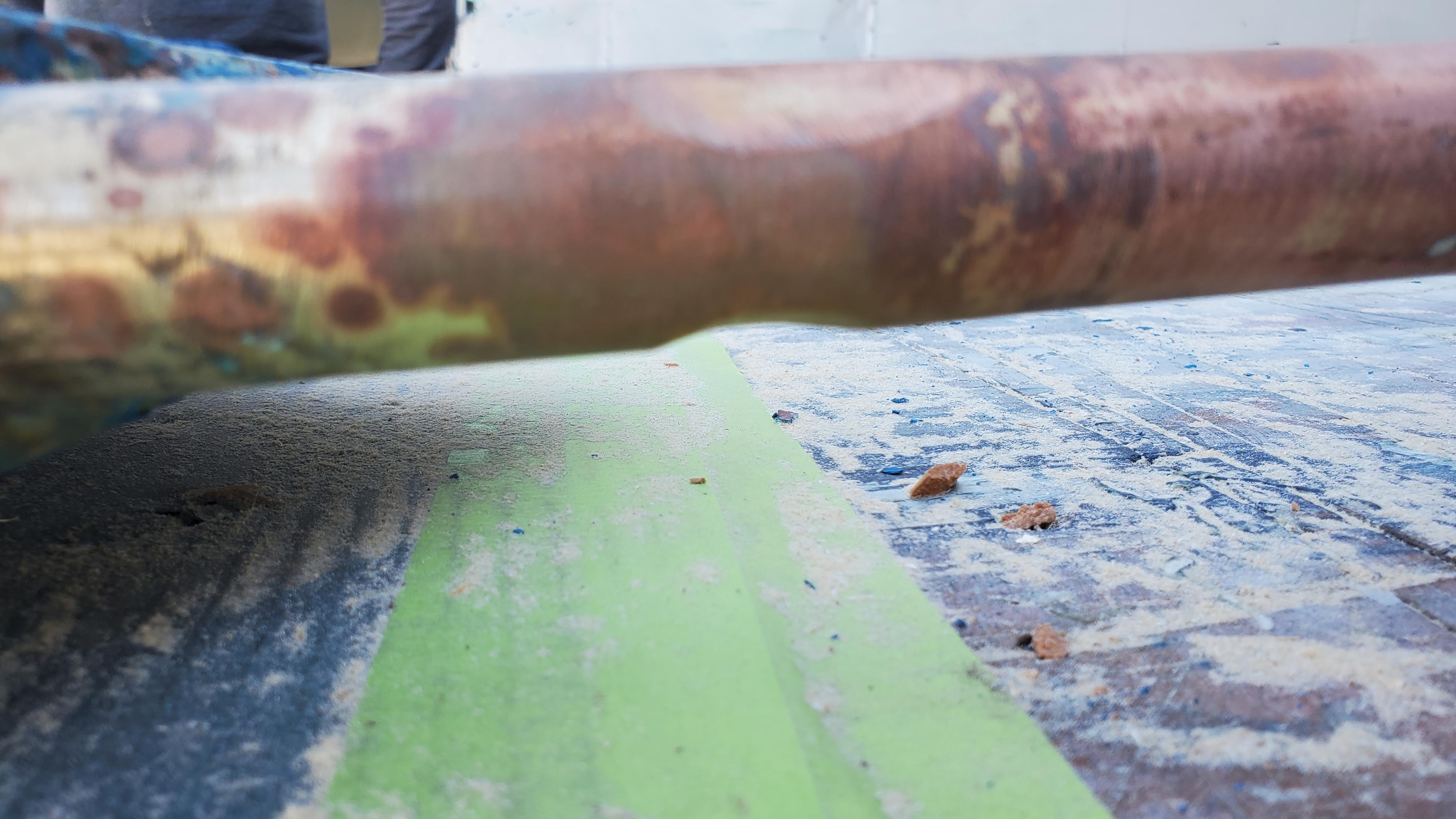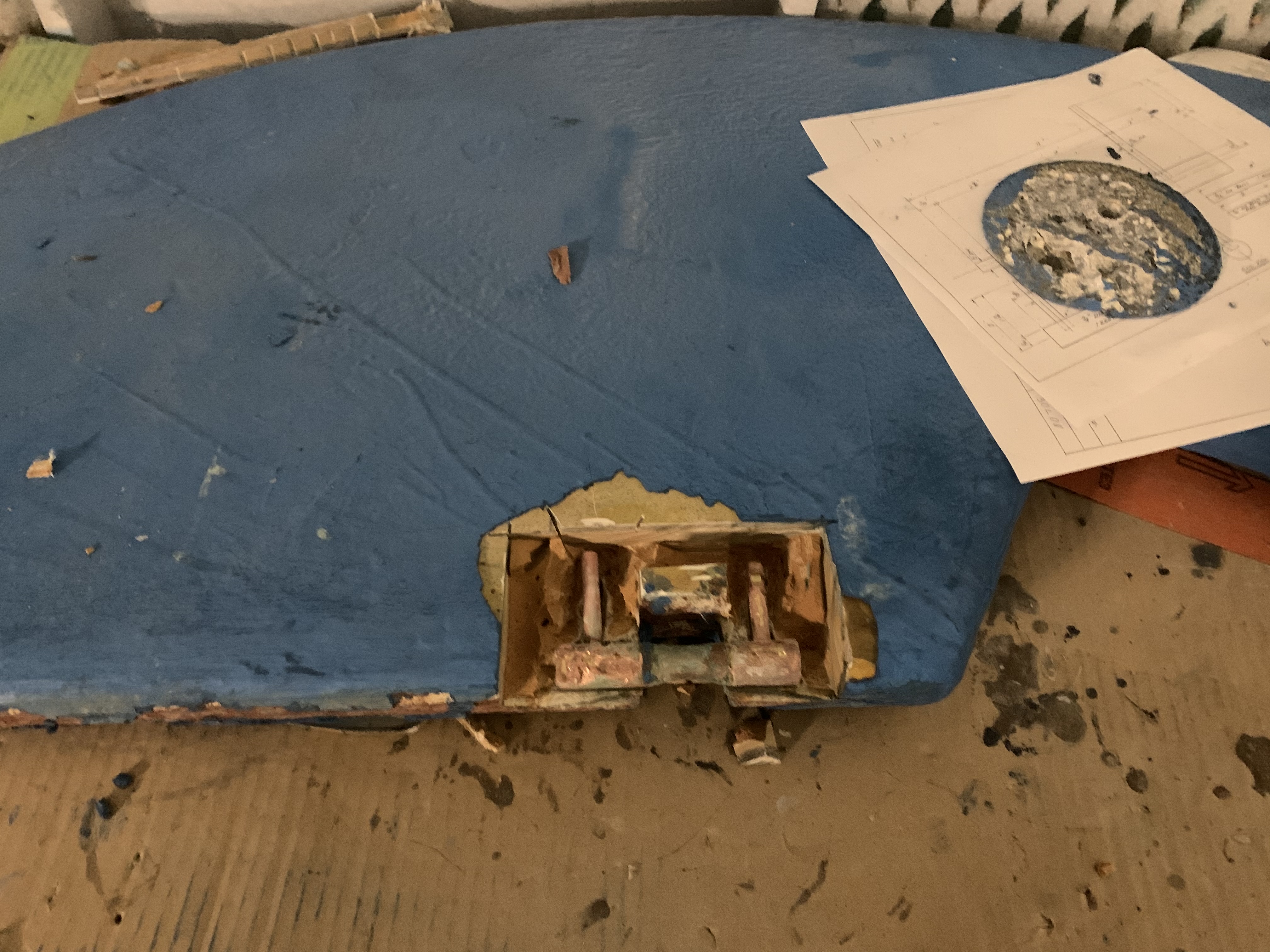 If there was a bit more pin, the solution is just to make a bushing to fit between the hole in the rudder shoe and the pin. But this pin was too far gone for that. The second solution is to cut out the pin, drill and tap a hole in the bottom section and screw in a new pin. I might have done that if there hadn't been other problems.