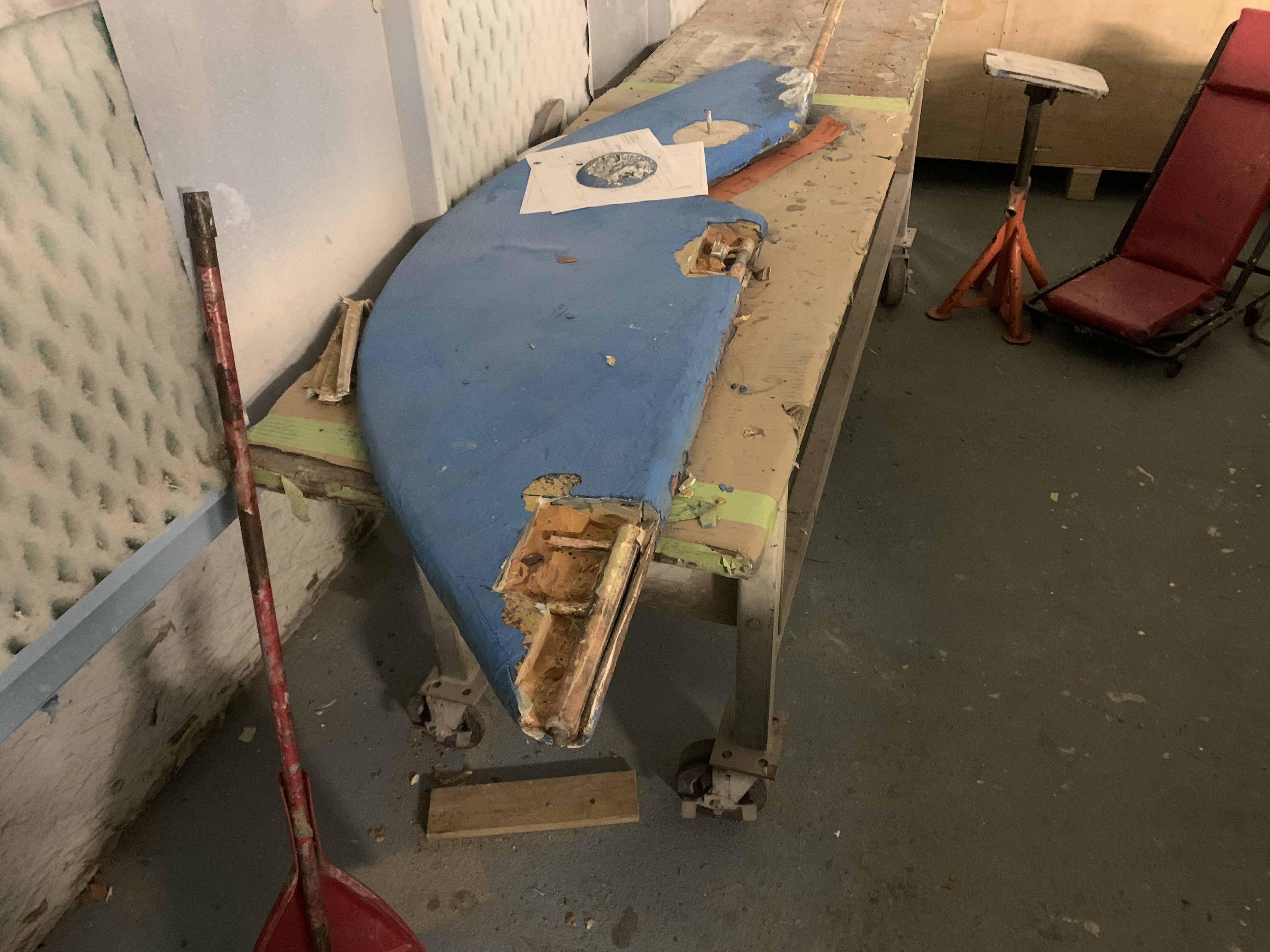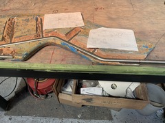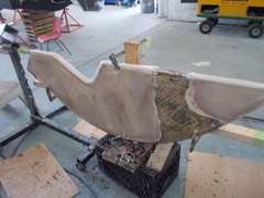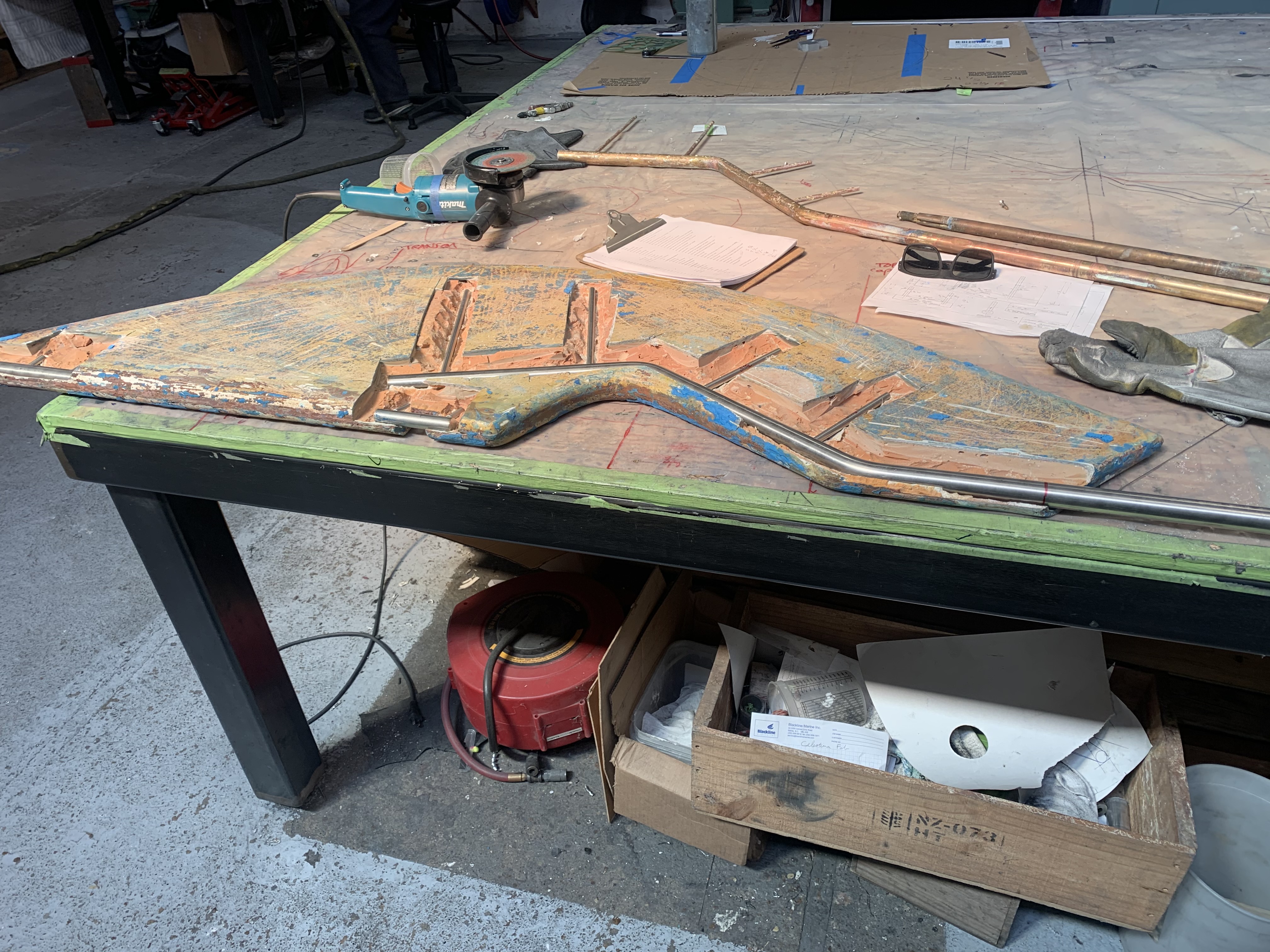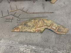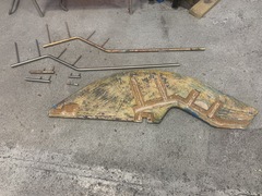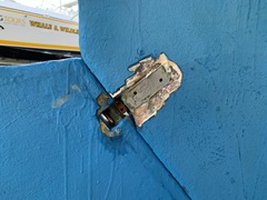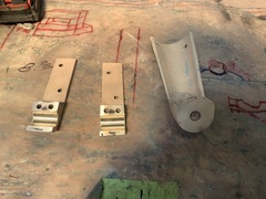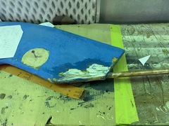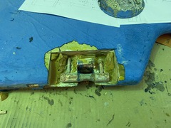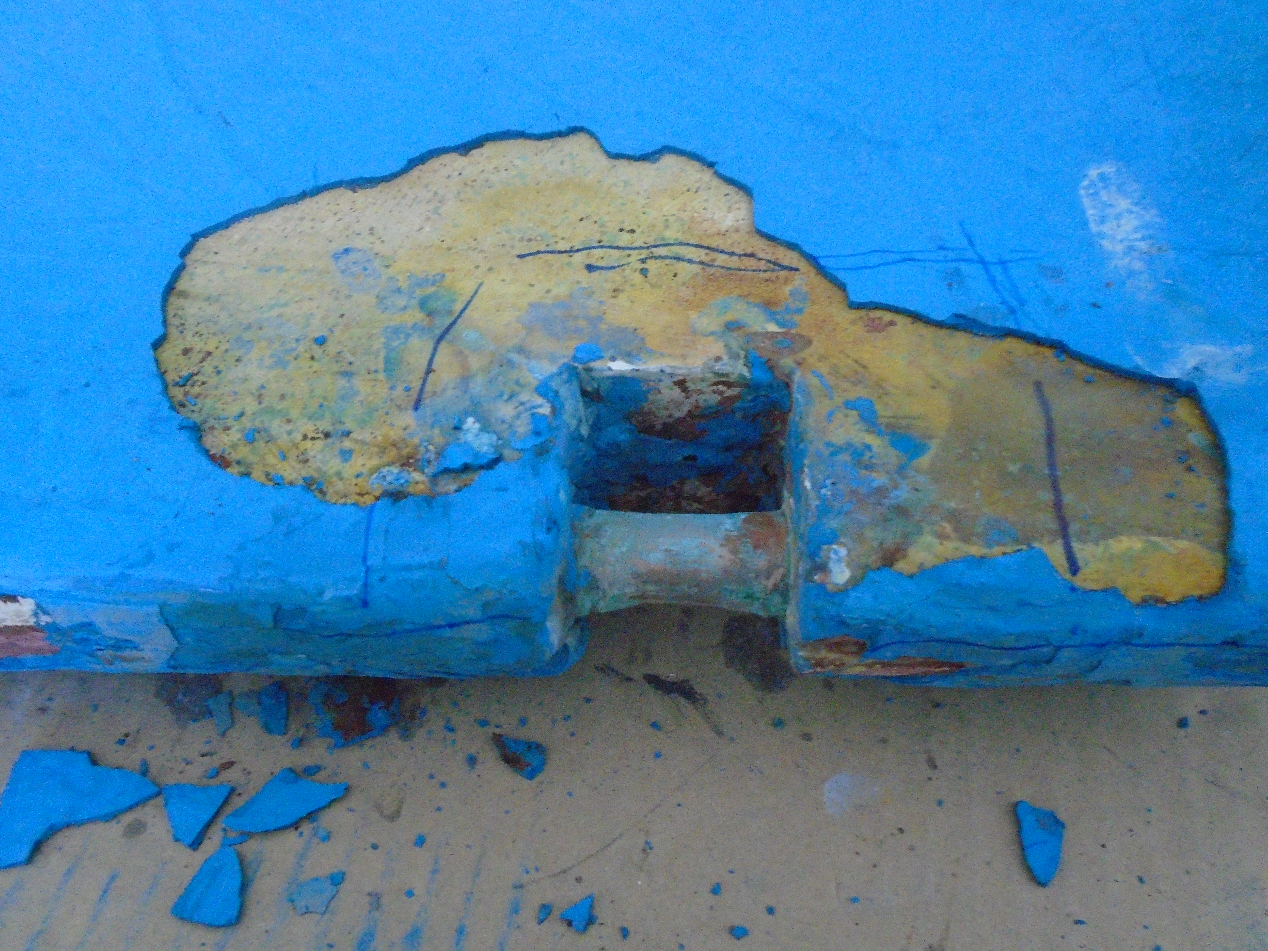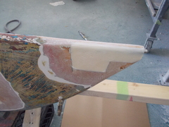 The thin spurs coming out of the top section are largely ornamental. They're quite thin. The torque from the tiller is transmitted to the rudder because the 1-inch upper shaft has bends in it, not because of the spurs, which can be bent by hand. One the two smaller bits, the spurs stop the part from spinning with the rudder. One the midpoint section the brazing had failed. On my boat, the 3 parts were not correctly aligned. The midpoint section was 1/8 inch out of column with the top and bottom sections, probably because it's thinner (3/4 inch) and whoever put the rudder together back in 1972 lined up the sides of the parts, not the centres. All in all, it was pretty obvious that the rudder needed to be removed and all the metal replaced. Removing the rudderAt least one Alberg has a bolt on rudder. I don't. Removing the rudder was a lot of work. First off, the propellor shaft blocks the rudder from dropping down. That meant either pulling out the propellor shaft altogether or moving the engine forward 2 inches and pushing the propellor shaft forward 2 inches so the rudder can clear the end. The first option mean removing the coupling from the engine and also removing it from the shaft. I was advised that removing the coupling from the shaft would be a lot of work in a very confined space, so I went with moving the engine forward. It was also a lot of work. I'm still not sure that was the way to go. Actually, I am sure, because it revealed that two of the bolts holding down the engine were rusted out, which I wouldn't have found out otherwise. But if there hadn't been any other problems, I think it's about 50-50 which way to go. Because the engine only had to be moved a few inches, it was really only a question of removing a few bolts. Most of the hoses and wires could stay in place. Next problem is that access to the rudderpost stuffing box was needed. On my boat, this is behind and under the gas tank. I've removed the gas tank on two previous occaisons, so this step was fairly straightforward, if annoying. I removed the wooden bulkhead between the engine compartment and the starboard cockpit locker. The first time I did this, it took a while because I was nervous about wrecking the bonds between the fibreglass and the wood. But when I put it back, I just screwed everything back together so it's relatively easy to remove, as long as you don't mind spending an hour kneeling in the cockpit, with your head below knee level in the cockpit. There are people who will tell you that the way to remove a rudder is to dig a hole under the stern of the boat while it's on the hard. I'm not sure how that would work. The rudder post is at an angle, so you would have to dig the hole under the aftermost part of the keel, leaving it unsupported. Anyway, the yard frowns on hole-digging and lifted the boat to drop the rudder. At this point, it was discovered that the packing in the rudder stuffing box hadn't been put in correctly and was leaking slightly. Rebuild
