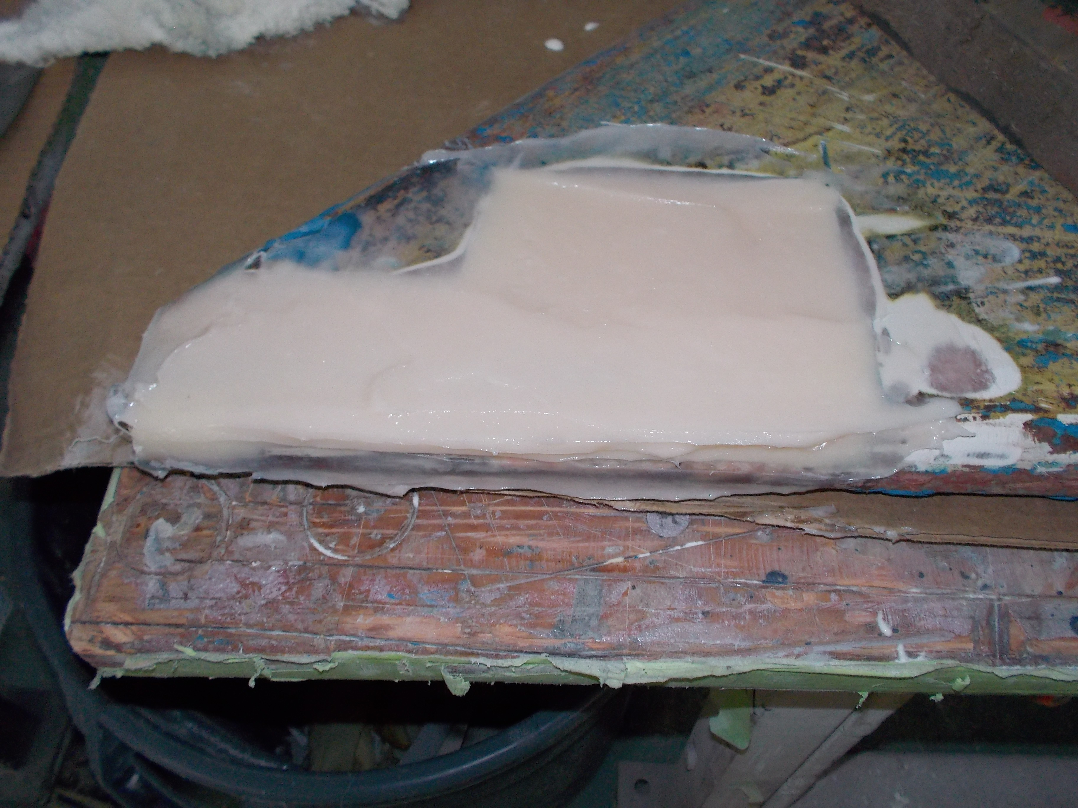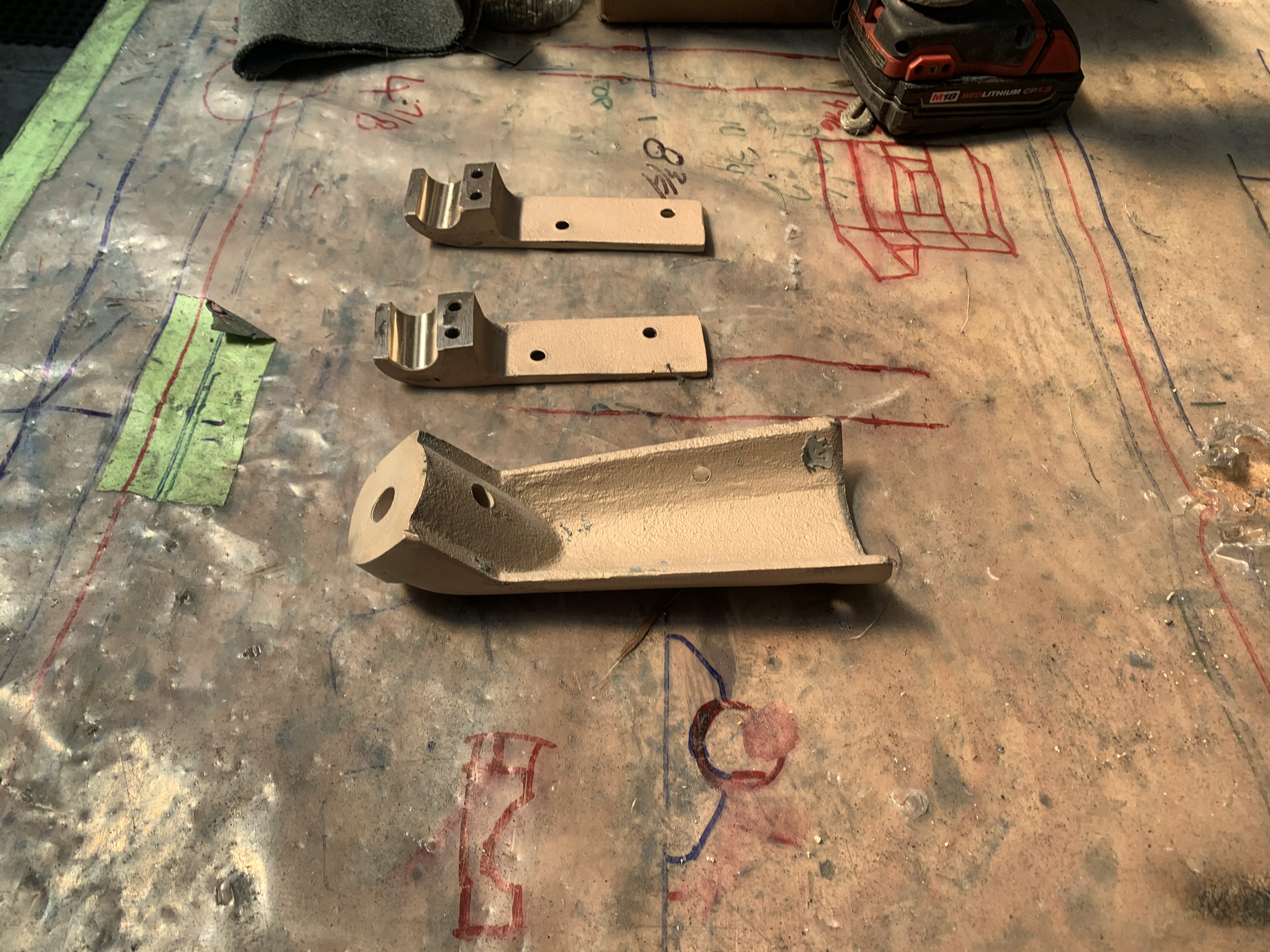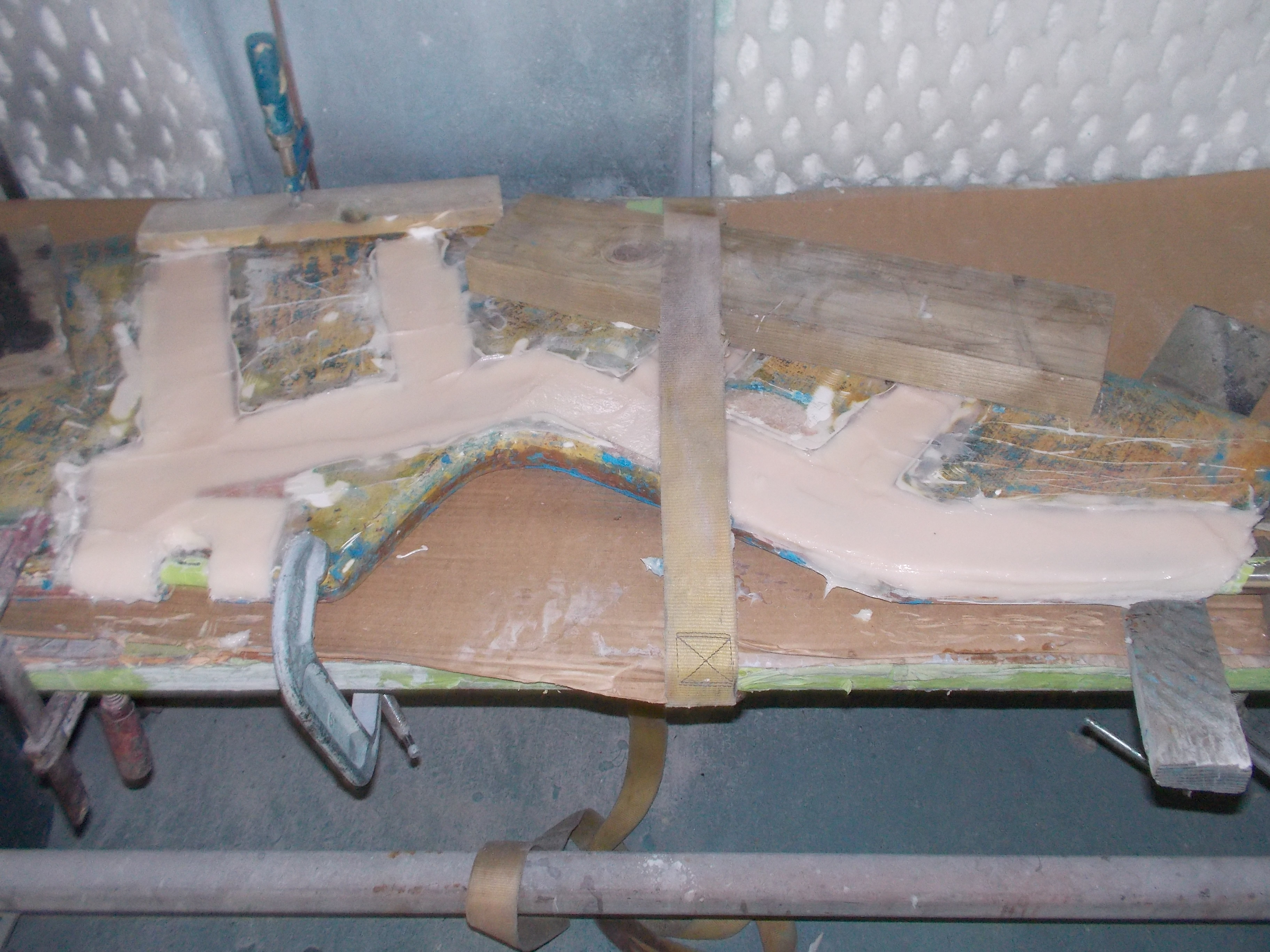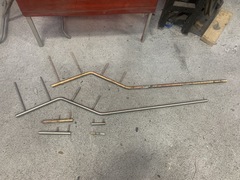 The thin spurs coming out of the top section are largely ornamental. They're quite thin. The torque from the tiller is transmitted to the rudder because the 1-inch upper shaft has bends in it, not because of the spurs, which can be bent by hand. One the two smaller bits, the spurs stop the part from spinning with the rudder. One the midpoint section the brazing had failed. On my boat, the 3 parts were not correctly aligned. The midpoint section was 1/8 inch out of column with the top and bottom sections, probably because it's thinner (3/4 inch) and whoever put the rudder together back in 1972 lined up the sides of the parts, not the centres. All in all, it was pretty obvious that the rudder needed to be removed and all the metal replaced. Removing the rudderAt least one Alberg has a bolt on rudder. I don't. Removing the rudder was a lot of work. First off, the propellor shaft blocks the rudder from dropping down. That meant either pulling out the propellor shaft altogether or moving the engine forward 2 inches and pushing the propellor shaft forward 2 inches so the rudder can clear the end. The first option mean removing the coupling from the engine and also removing it from the shaft. I was advised that removing the coupling from the shaft would be a lot of work in a very confined space, so I went with moving the engine forward. It was also a lot of work. I'm still not sure that was the way to go. Actually, I am sure, because it revealed that two of the bolts holding down the engine were rusted out, which I wouldn't have found out otherwise. But if there hadn't been any other problems, I think it's about 50-50 which way to go. Because the engine only had to be moved a few inches, it was really only a question of removing a few bolts. Most of the hoses and wires could stay in place. Next problem is that access to the rudderpost stuffing box was needed. On my boat, this is behind and under the gas tank. I've removed the gas tank on two previous occaisons, so this step was fairly straightforward, if annoying. I removed the wooden bulkhead between the engine compartment and the starboard cockpit locker. The first time I did this, it took a while because I was nervous about wrecking the bonds between the fibreglass and the wood. But when I put it back, I just screwed everything back together so it's relatively easy to remove, as long as you don't mind spending an hour kneeling in the cockpit, with your head below knee level in the cockpit. There are people who will tell you that the way to remove a rudder is to dig a hole under the stern of the boat while it's on the hard. I'm not sure how that would work. The rudder post is at an angle, so you would have to dig the hole under the aftermost part of the keel, leaving it unsupported. Anyway, the yard frowns on hole-digging and lifted the boat to drop the rudder. At this point, it was discovered that the packing in the rudder stuffing box hadn't been put in correctly and was leaking slightly. Rebuild