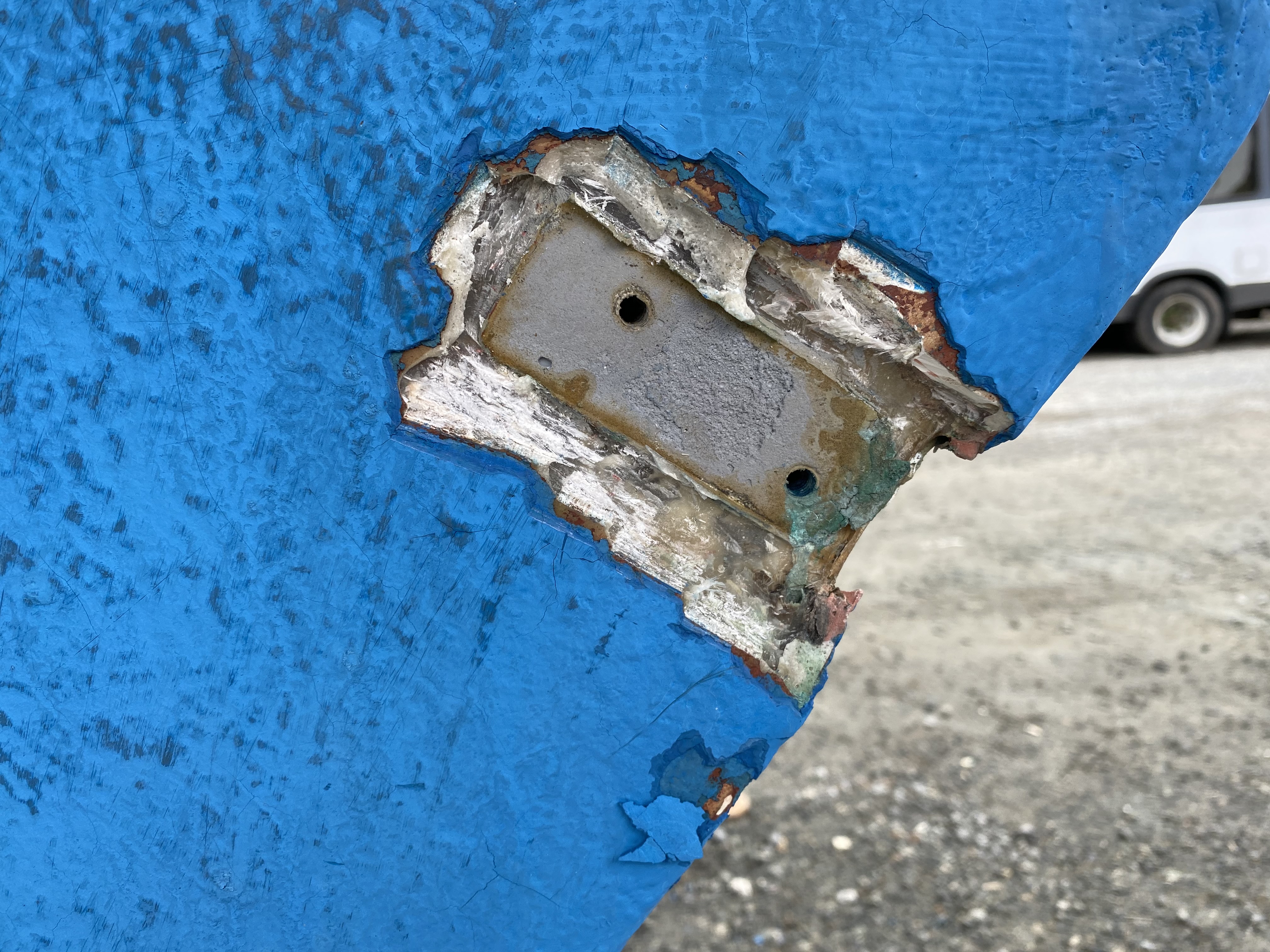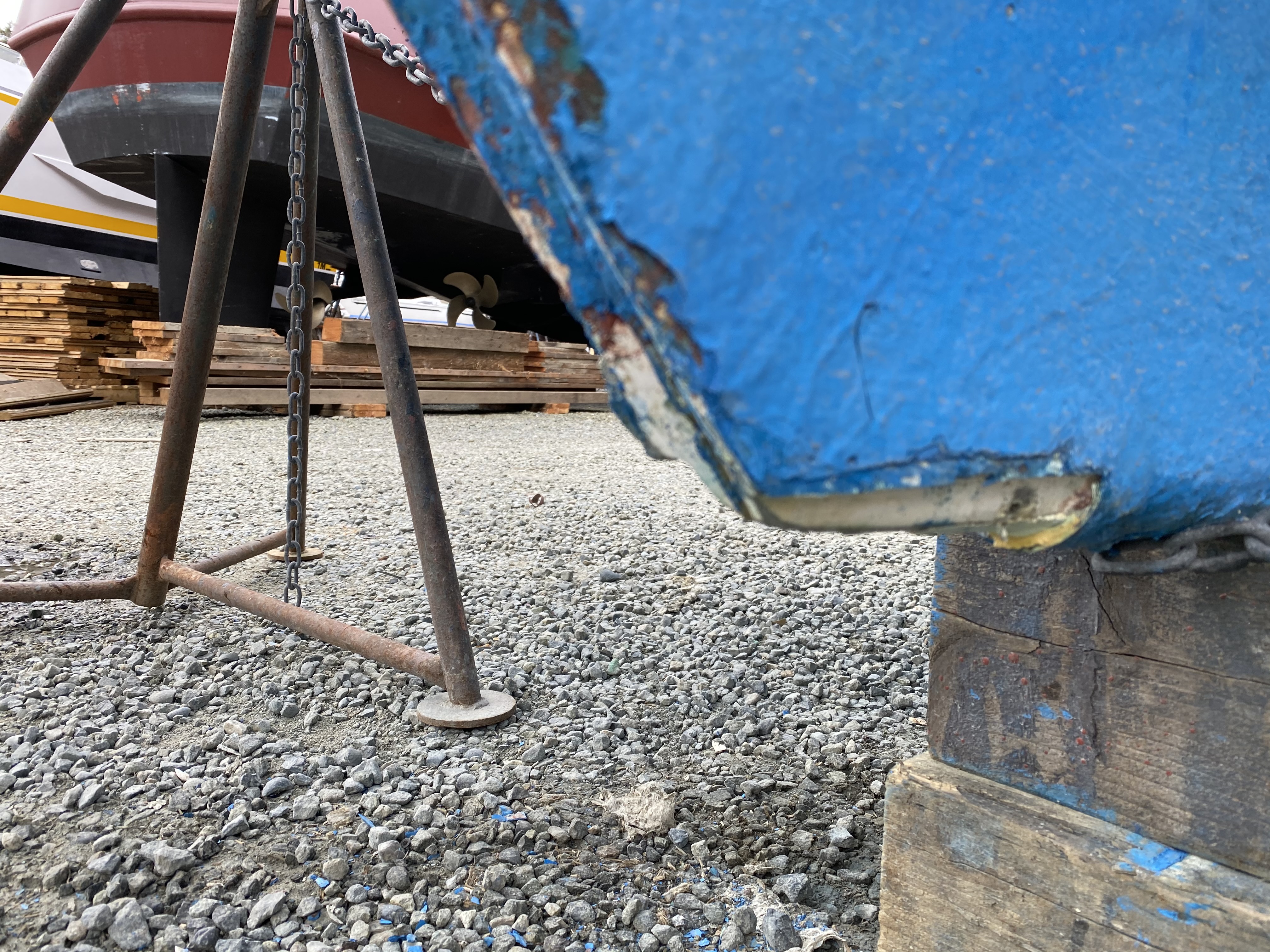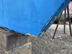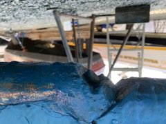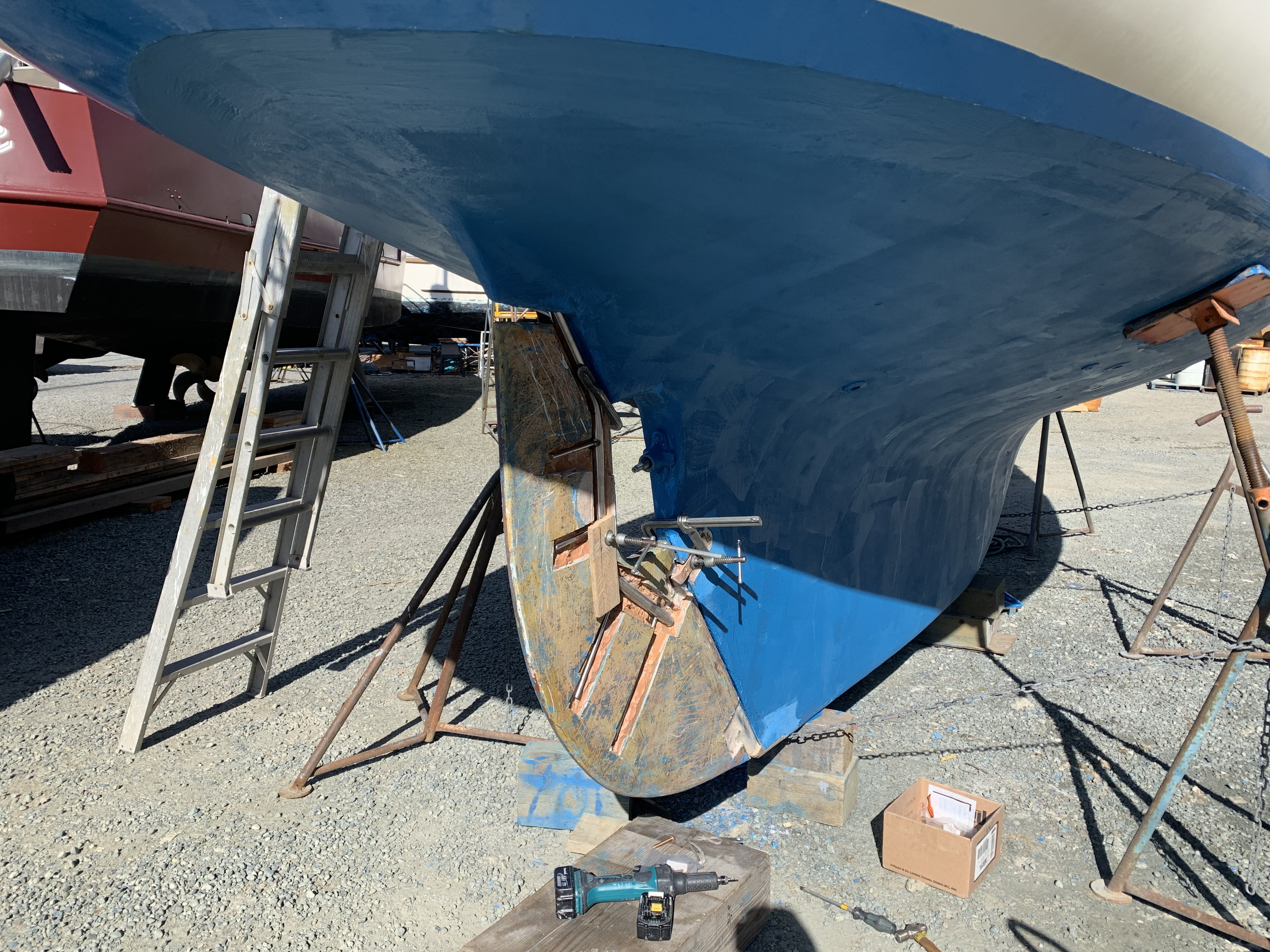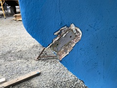 I left all this stage to the professionals. I simply did not have time and space to do this. I also don't have the tools to bend 1-inch stainless rod, or weld. But as you can imagine, it wasn't cheap. The result is, however, better than new. Stronger, and built to a higher precision than Whitby Boatworks did when they built the boat in the first place. The reinstallion was pretty straightforward, with another lift of the boat, and inserting the rudder. Note that the screws that hold the rudder shoe actually penetrate the hull, at least on my boat. The yard guys says he sees this a lot on full keel boats. When they're being built, getting all the glass and resin in to the very bottom behind the deadwood sometimes doesn't happen as well as it should. The upshot is that those bolts need to be properly sealed. Then a few hours of work getting the gas tank back in and the bulkhead re-installed. More Photos |