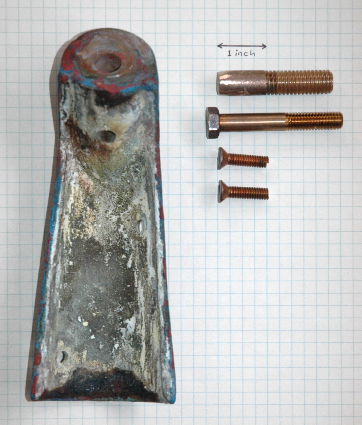 The rudder shoe fastens to the bottom of the aft end of the keel. It supports and steadies the bottom of the rudder. It is mounted (generally) with a 3/8"-NC16 x 2" hex cap screw from the aft end and two 1/4"-NC20 x 1" flat head machine screws from the sides. These are screwed into holes tapped into the fiberglass. The rudder pin which fits into the socket of the shoe has been fabricated in a number of different ways by Whitby. Quite often it's a headless threaded bolt that's screwed into a tapped hole in the end of the lower rudder post. On Calypso, #543, the lower rudder post was a length of 1" diameter naval brass that had been turned down to 1/2" at the end to form the pin. When that corroded away, I (or rather Doug Townshend did it for me) drilled and tapped for a 1/2"-NC13 bolt. Many of the earlier boats already had such an arrangement from the factory. The picture shows a 1/2"-NC13 x 2" carriage bolt or hex cap screw with the head cut off to form the pin. On another boat, where the hole in the shoe had worn, I've used a 5/8" bolt, instead. All of these fasteners should be bronze (preferably silicon bronze). See the article on crevice corrosion for the reason to not use stainless steel. I also recommend, as Bruce Rankin recommended to me, that you bed the rudder shoe with 3M 5200 caulk. This is very adhesive stuff, and you don't want the rudder shoe to fall off. When you go to remove it for inspection or replacement of the pin, just heat the shoe with a propane torch and the caulk will soften. Finding appropriate fasteners has become rather difficult. The two larger bolts should not be fully threaded, but should be shoulder bolts, as shown. Most places seem to carry only imported, fully threaded bronze fasteners. I found the bolts I needed at Jamestown Distributors, but they weren't cheap--about 5 to 6 times more expensive than the fully threaded variety. |