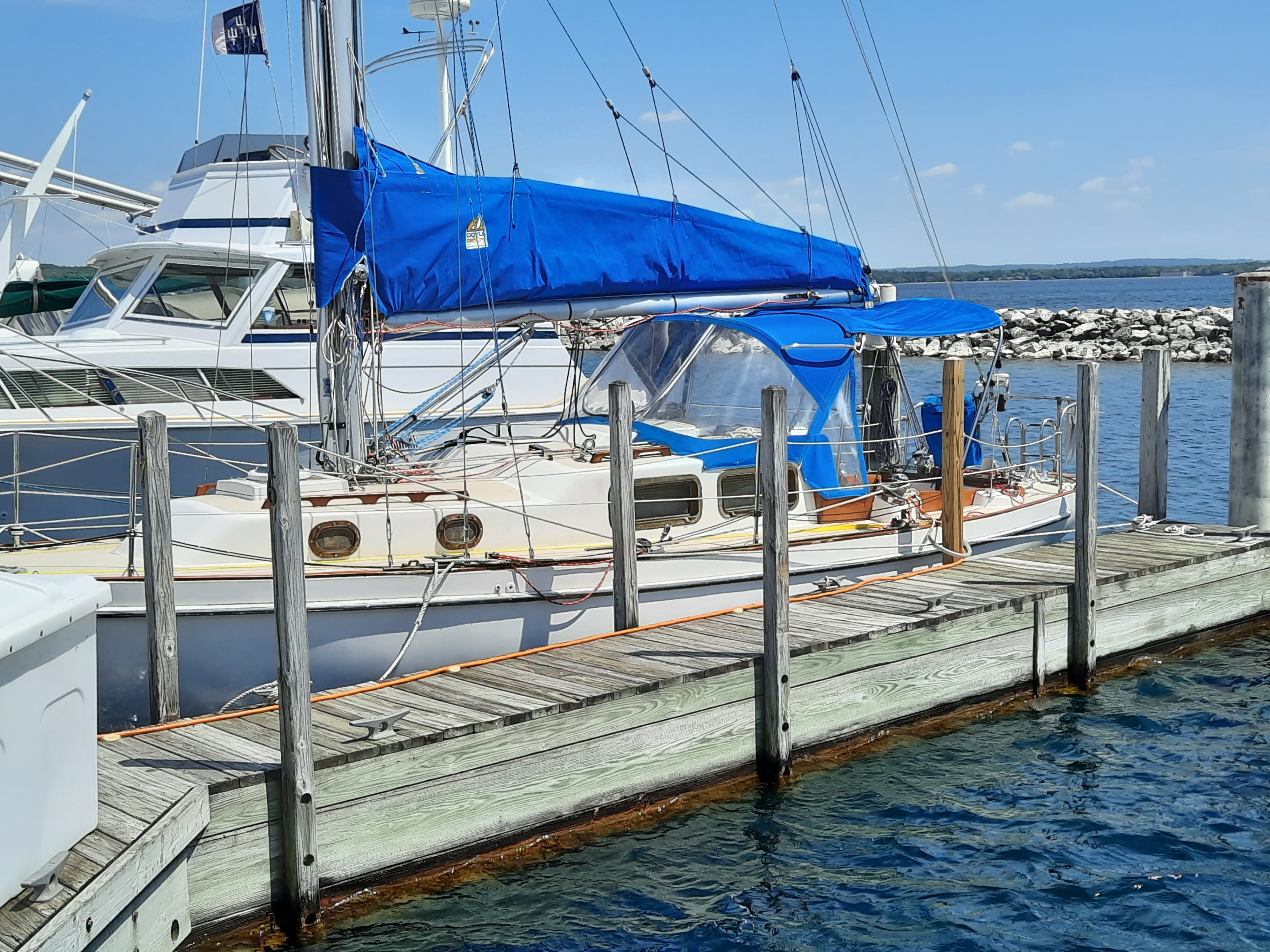 The Dodger/Bimini was built by Grand Traverse Canvas, Traverse City, MI. in 2014. The fabric is Sunbrella. The Dodger frame and canvas cost $4,000. The bimini frame and canvas was another $1,500 and the side curtains were an extra $500. The bimini can be separated from the dodger so the dodger can be used alone. For the bimini to be left in place and the dodger removed would require an additional frame for the front edge of the bimini. The side curtains enclose the entire cockpit area. The unique feature are the handholds on either outside of the dodger and overhead at the dodger bimini juncture. Because these handholds are not just a pretty face the Stainless Steel framework is of a much stronger design than would be needed to just hold up the canvas. This has turned out to be a proven design. There is a little wear at the points the handholds are bolted through the canvas and the clear windows are a little fogged. (Plastic polish would clean this up.) In speaking with David in June of 2021 he would not make any changes in the design. He stated that: "It has functioned as it was designed to do." The attached photos speak of the durability. The first set were taken underway in October of 2014. The second set were taken dockside in June 2021.