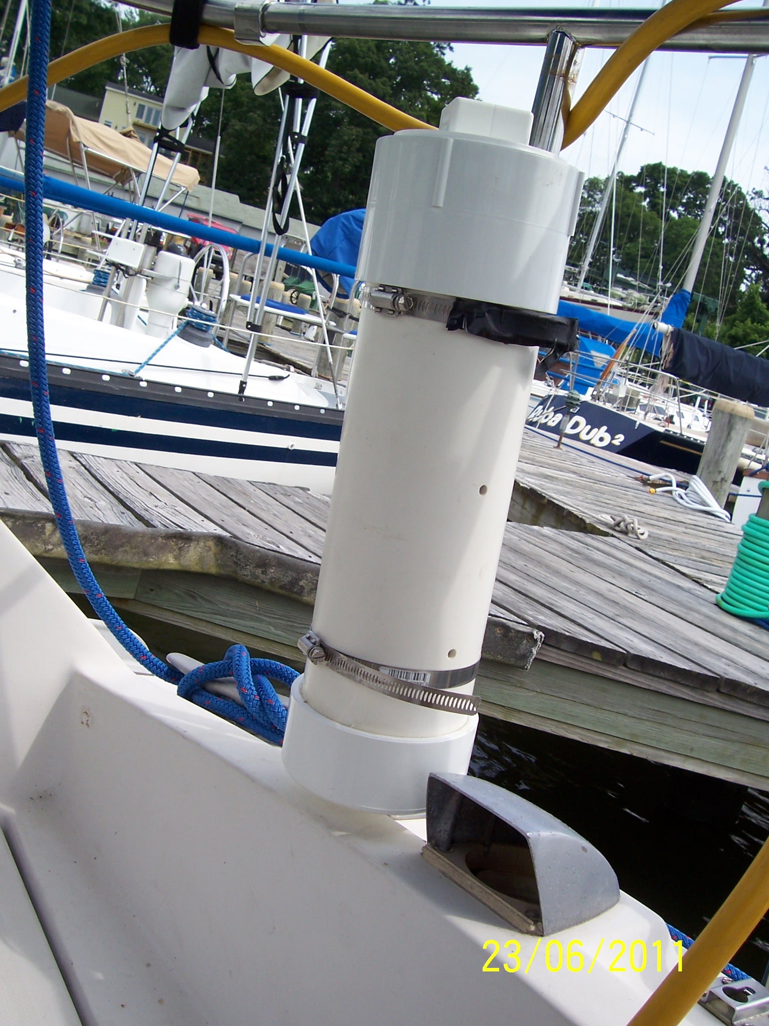 The propane stove I installed was a camping stove hence it uses the small bottles of Propane. The Holder for two bottle was made from 4 inch PVC Pipe. The bottom is a Cap, the top is a Threaded Fitting with a Threaded Cap. The pipe is long enough to hold 2 bottles; don't know it's length. The bottom Cap is drilled to drain any water that may enter. The Pipe is drilled for Vent holes.