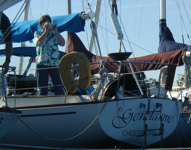Loretta blows the conch, signaling the start of the party. (Photo copyright 2001 by George Dinwiddie. All rights reserved. For permission to reproduce, please contact webmaster@alberg30.org)